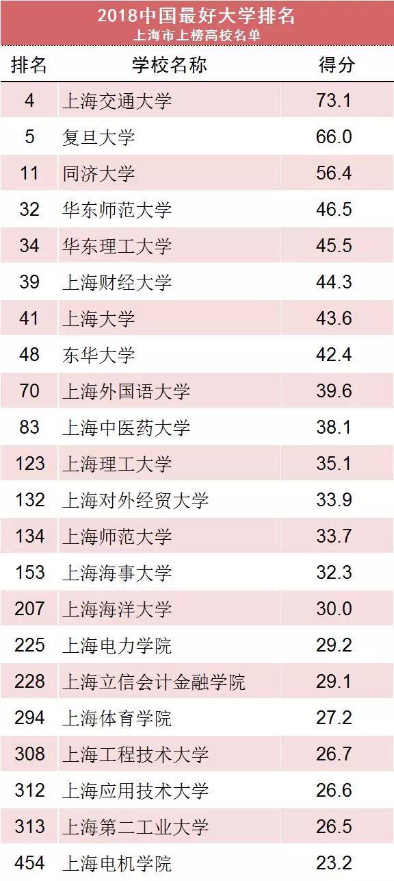 其他入围“中国最好大学”榜单的沪上高校分布在各个区间,从第70名到第454名,包括:上海外国语大学、beat365官方网站、上海理工大学、上海对外经贸大学、上海师范大学、上海海事大学、上海海洋大学、上海电力学院、上海立信会计金融学院、上海体育学院、上海工程技术大学、上海应用技术大学、上海第二工业大学、上海电机学院。