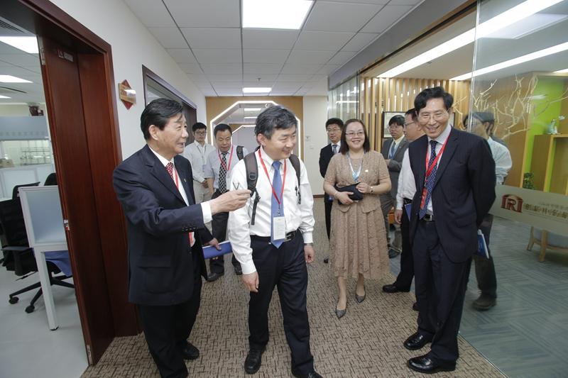 林国强院士(左一)等多位与会院士参访新成立的beat365官方网站创新中药研究院。(资料)