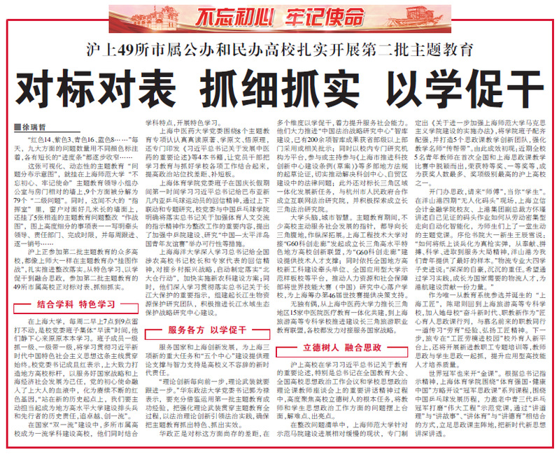 文汇报:沪上49所市属公办和民办高校扎实开展第二批主题教育 对标对表抓细抓实以学促干