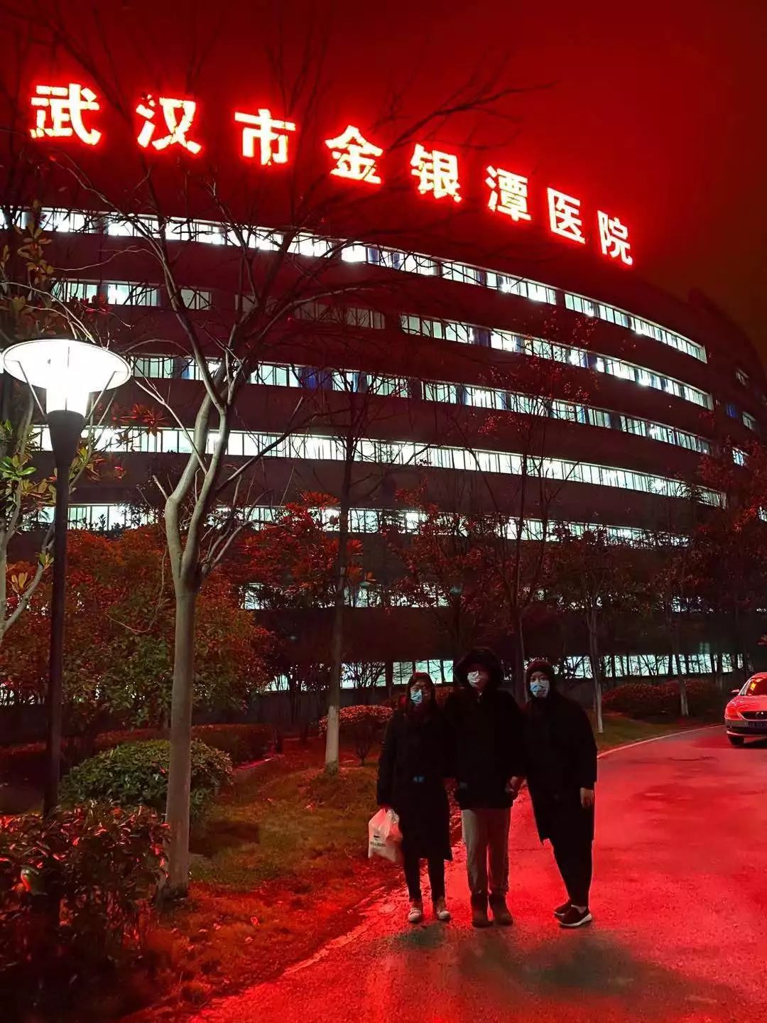 △凌晨2点多,从医院返回住处时,三位曙光医院医务人员在金银潭医院门前合影