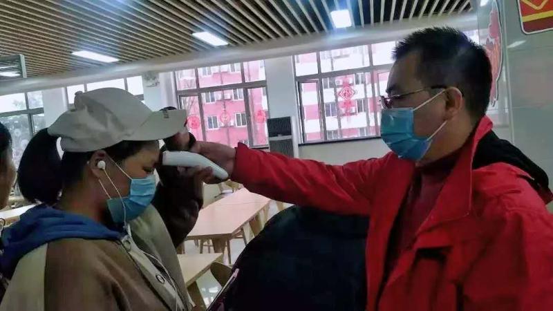 上海健康医学院附属卫生学校内地西藏中职班班主任施卫国老师留守校园,尽责做好留校生的疫情防控工作。图为他为在校生测量体温。