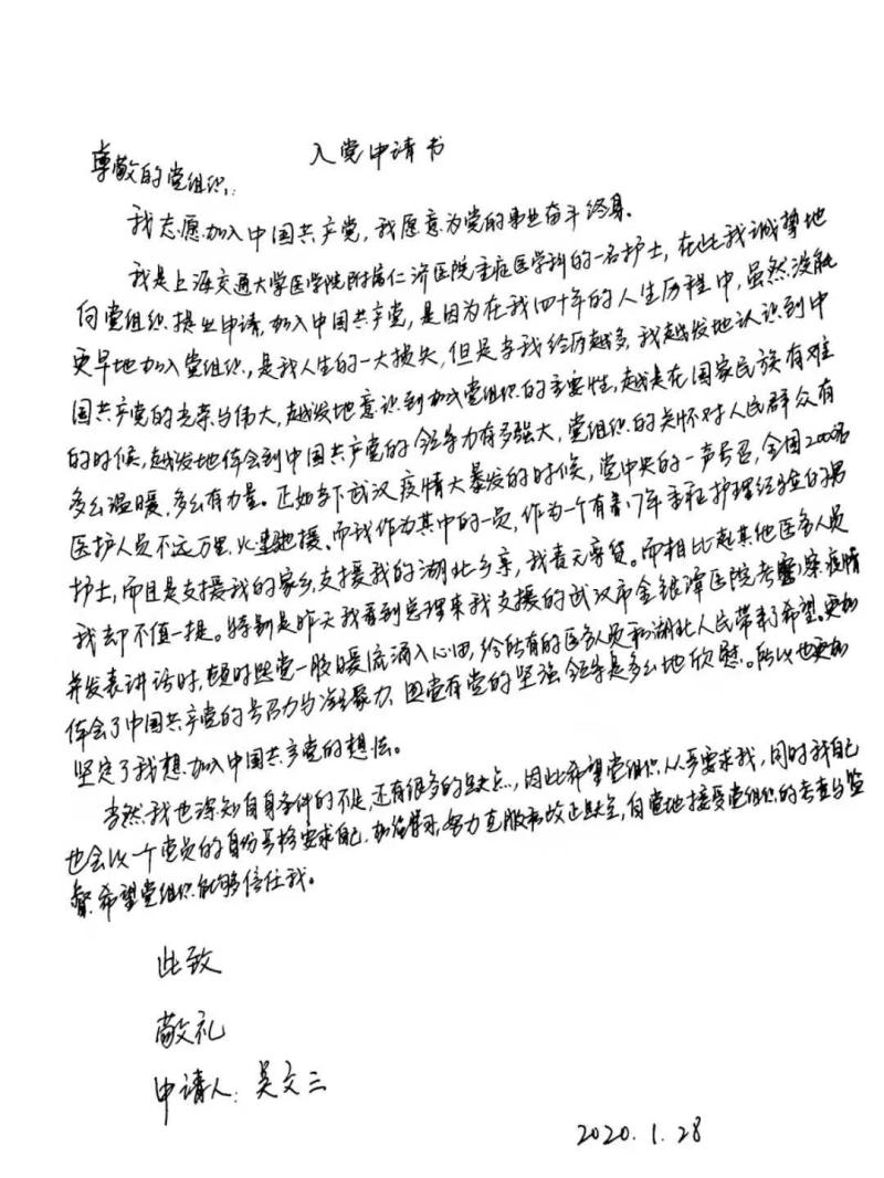1月28日,第一批赶往武汉抗击疫情的上海交通大学医学院附属仁济医院重症医学科护士吴文三,在抗疫最前线的武汉金银潭医院递交了入党申请书。
