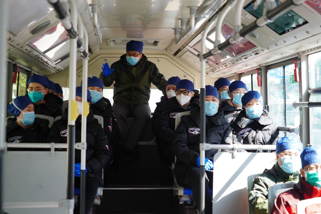 13时23分,医疗队所有122名队员乘公交车去熟悉“主战场”——雷神山医院。当地司机很热心,主动帮助搬运呼吸机。岳阳医院领队李斌告诉同车队员,此去要代表中医形象,也要代表医疗队形象。或许是为了活跃气氛,经历过“小汤山”、汶川地震救援的“老兵”樊民给大家讲起了之前的故事。“‘小汤山’当年很多年轻医生和刚毕业的护士,大家是从穿着防护服、戴着口罩护目镜认识彼此的,等到脱了防护服,相认居然要愣神儿。”