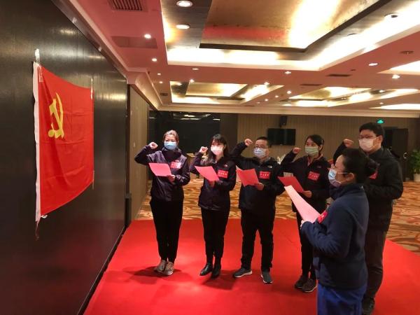 3月7日下午,上海中医支援湖北医疗队临时党支部在驻地举行入党宣誓仪式。上海曙光医院支援湖北医疗队员陈佳、倪琦、吕婵与医疗队其他8名同志一起,在临时党支部委员的见证下,在鲜红的党旗下庄严宣誓,在武汉前线光荣加入中国共产党,成为中共预备党员。