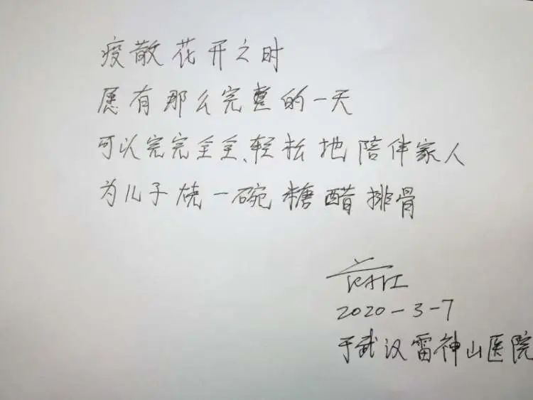 1、疫散花开之时,愿有那么完整的一天,可以完完全全、轻松地陪伴家人,为儿子烧一碗糖醋排骨。—第八批上海援鄂医疗队副队长、上海市第六人民医院党委副书记范小红