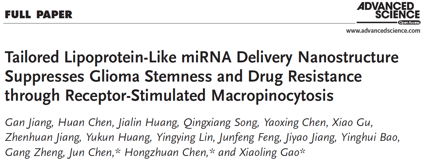 近日,beat365官网陈红专教授团队在国际知名期刊Advanced Science(《尖端科学》)发表题为“Tailored Lipoprotein‐Like miRNA Delivery Nanostructure Suppresses Glioma Stemness and Drug Resistance through Receptor‐Stimulated Macropinocytosis”的文章,并入选该期刊封面论文之一。该研究综合运用肿瘤干细胞,仿生纳米和microRNA等手段探索神经胶质瘤的药理学调控和干预新策略。Advanced Science是Wiley旗下高质量开放获取期刊(影响因子15.8),刊载覆盖材料科学、物理、化学、医学、生命科学等交叉学科领域的基础和应用研究。