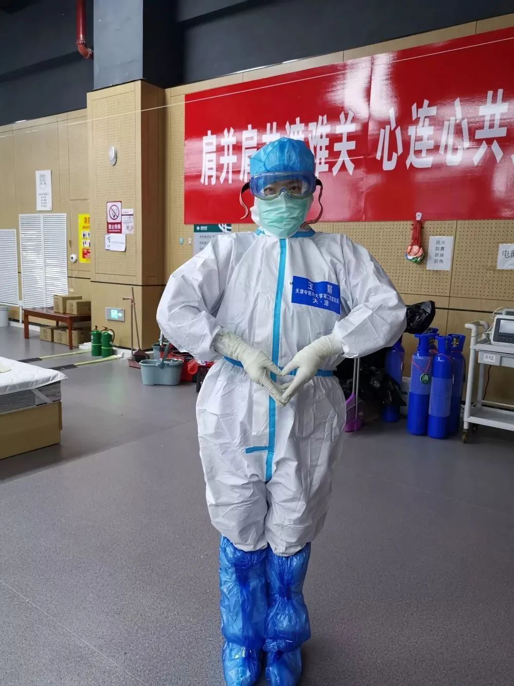 来自全国几个省市的医疗队员共聚一起,大家非常融洽,相互帮助整理彼此的防护用具,情同兄弟姐妹。心灵手巧的闫蓓老师更是把她的艺术细胞发挥到了极致,提前把我的“战服”装饰的又可爱又有力量!不仅被同病区的战友们围观,更是被病房里的患者点赞,有一位患者叔叔360度观赏、大加赞叹,脸上也露出了久违的笑容!