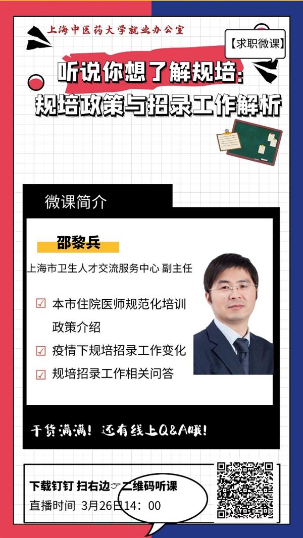 为响应毕业就业指导需求,同时以课程为引导,激发学生主动求职意识、了解中医药行业发展趋势、以青春告白祖国,就业办在钉钉平台推出“职业生涯教育系列微课”。每周邀请跨界协同育人导师团、行业专家和政府顾问,从求职技能、生涯教育、行业政策和职场干货4大模块展开课程。在切实增强学生就业竞争力的同时,引导医、药等各专业学生认真思考职业规划,开拓眼界,到祖国最需要的地方去。