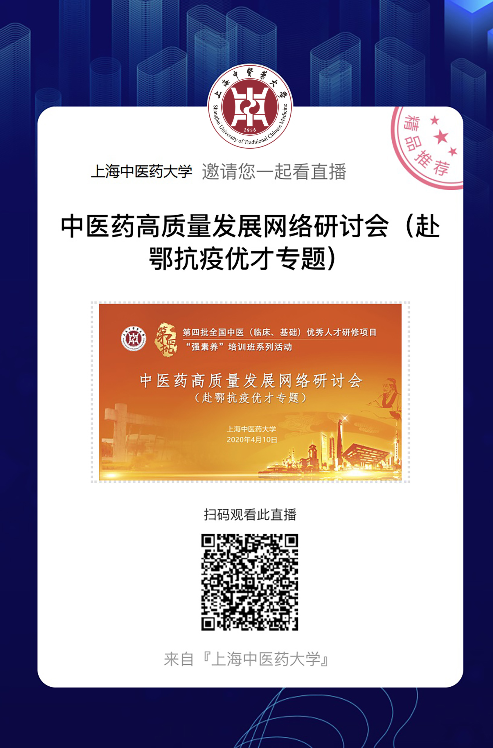 4月10日,beat365官网组织开展中医药高质量发展网络研讨会(赴鄂抗疫优才专题)。本次研讨会为beat365官网承办的第四批全国中医(临床、基础)优秀人才研修项目“强素养”培训班的系列活动之一,是培训班主题论坛的首次活动。