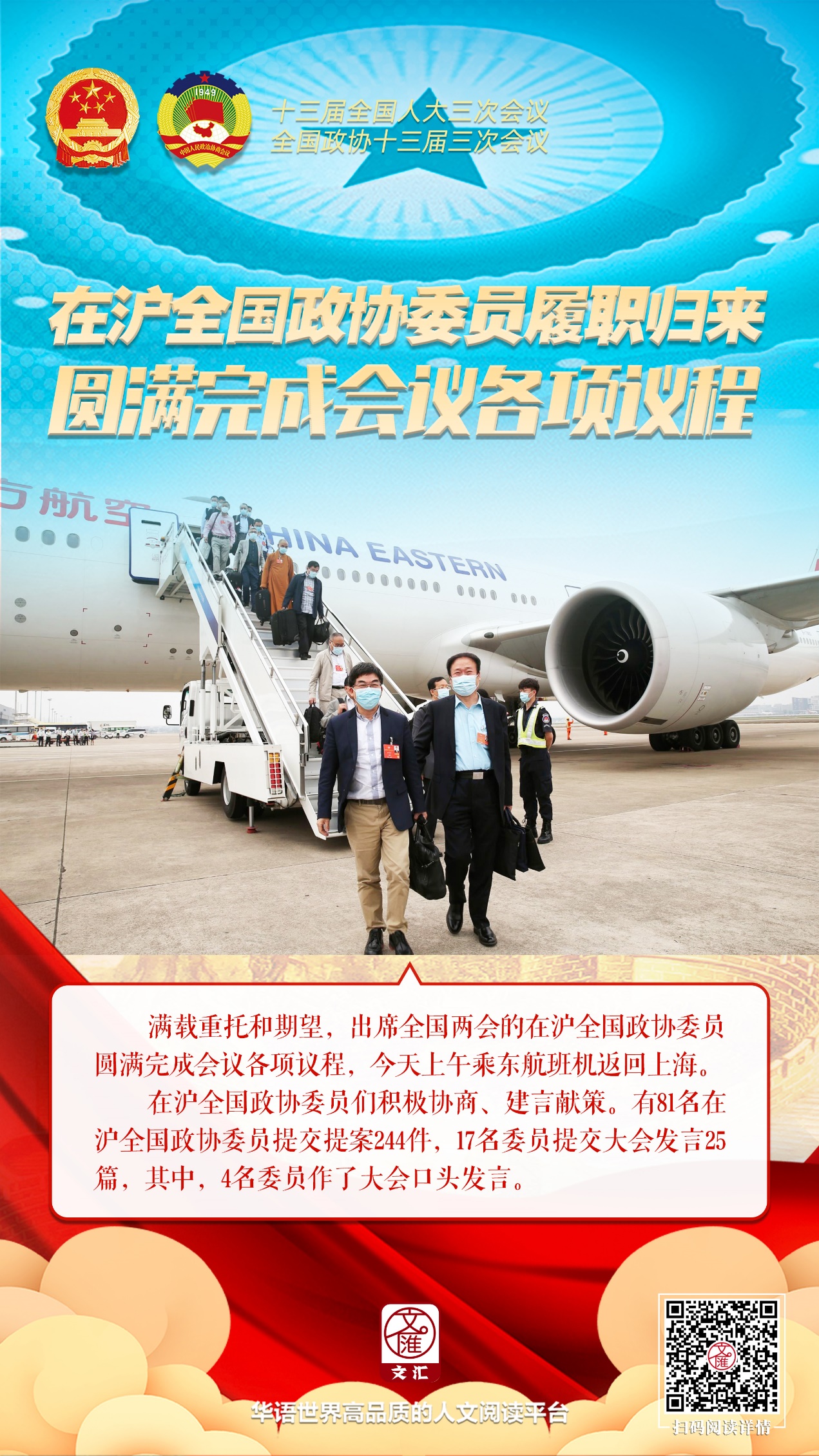 全国政协十三届三次会议5月27日下午在人民大会堂闭幕。满载重托和期望,出席会议的在沪全国政协委员圆满完成会议各项议程,5月28日上午乘东航班机返回上海。