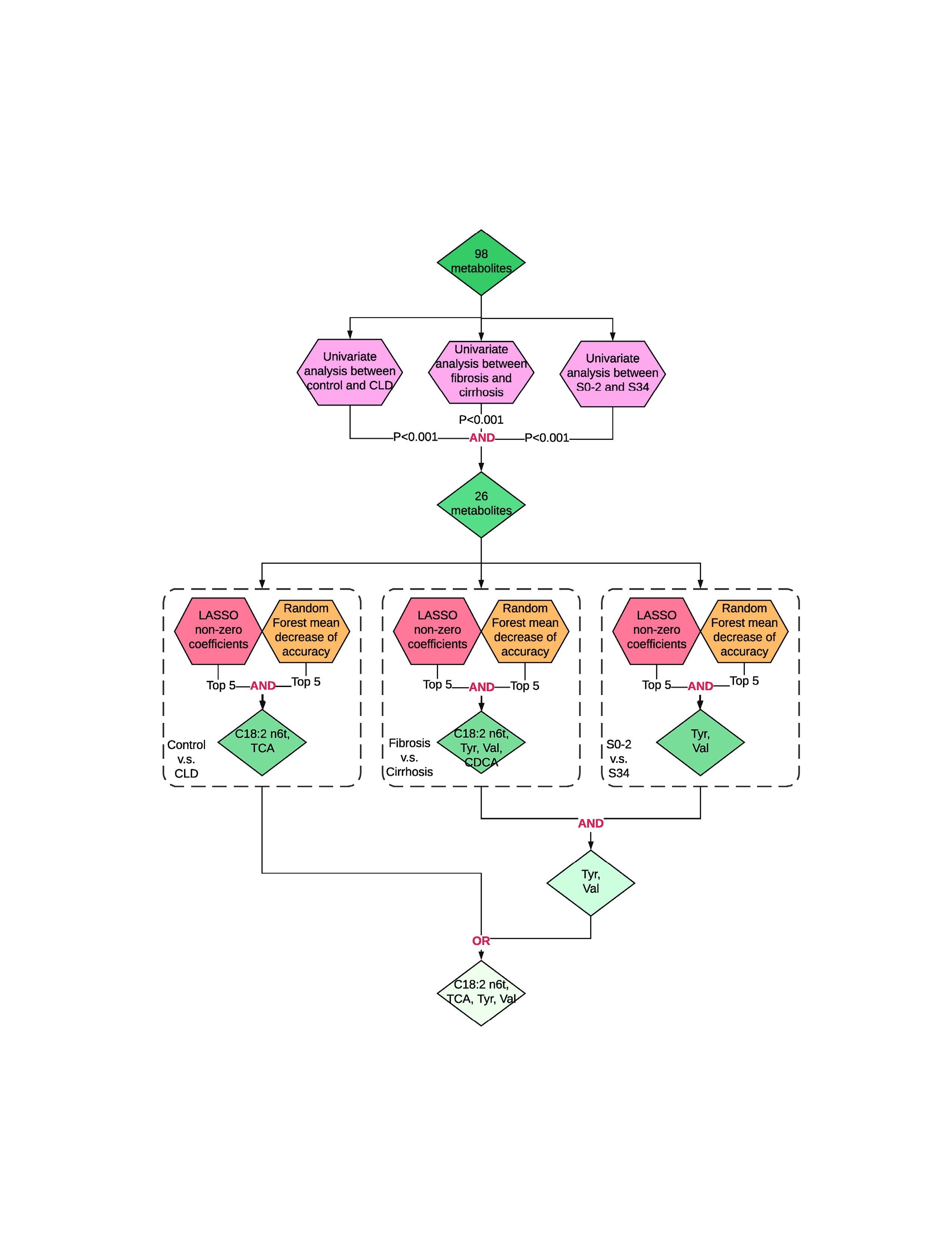 肝纤维化是慢性肝病进展为肝硬化甚至肝癌的关键病理阶段。肝组织穿刺活检是目前评价肝脏组织病理学损伤的金标准,但由于其创伤性限制了临床广泛应用。该研究采用靶向代谢组学方法定量分析患者血清胆汁酸、氨基酸、游离脂肪酸谱,根据LASSO算法和随机森林算法,筛选出4种预测性的代谢标志物(牛磺胆酸、酪氨酸、缬氨酸、反式亚油酸)。与现有的FIB-4指数、AST/ALT比值、APRI评分等临床指标比较,这4种代谢标志物能够更好地区分正常人与慢性肝病患者以及肝纤维化不同阶段。
