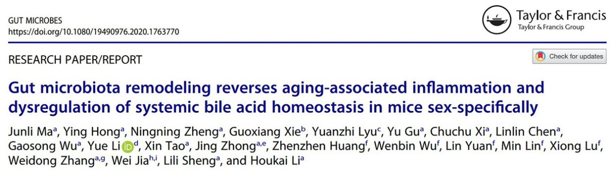 近日,beat365官网交叉科学研究院李后开团队在国际微生物学专业期刊Gut Microbes(一区,IF=7.823)在线发表了题为《肠道菌群重塑性别依赖性地改善老年小鼠的体内炎症与胆汁酸稳态失衡》(Gut microbiota remodeling reverses aging-associated inflammation and dysregulation of systemic bile acid homeostasis in mice sex-specifically)的研究论文。