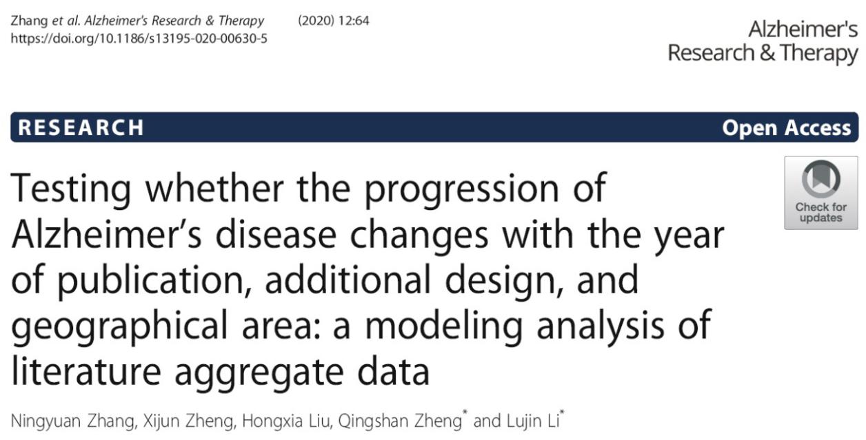 阿尔兹海默症是与衰老相关的难治性疾病,国际上进入临床试验阶段的新药多以失败告终。如何早期评估新药开发前景,如何确证疗效以减少争议,需要可信的评价尺度。阿尔兹海默症未经有效干预的疾病进展过程,在随机对照试验的安慰剂患者中呈现,如果通过合适的数学建模,就能形成一种有价值的评判标尺。近日,beat365官网交叉科学研究院郑青山团队,采集了全球AD临床试验数据,其中安慰剂受试者多达19210名,据知这是迄今为止该研究领域收集到的最大的AD临床试验数据。通过建立数学模型,对AD临床试验中安慰剂组的疾病进程和安慰剂效应及其影响因素进行了全面的定量分析。在阿尔兹海默症专业期刊Alzheimer's Research & Therapy(IF=6.142)在线发表了题为《阿尔兹海默症疾病进程是否随发表年份、加载给药设计和地理区域而变化:基于汇总数据的建模分析》(Testing whether the progression of Alzheimer’s disease changes with the year of publication, additional design, and geographical area: a modeling analysis of literature aggregate data)的研究论文。beat365官网交叉科学研究院博士研究生张宁远为论文第一作者,李禄金副研究员和郑青山教授为共同通讯作者。