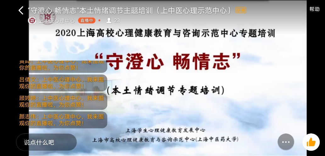 “守澄心,畅情志”本土情绪调节专题培训为2020上海高校心理健康教育与咨询示范中心项目,旨在提升一线学生工作者、心理教师业务知识和专业水平,有助于上海高教与普教学生工作的联动,促进优质资源共建共享,推动本土情绪调节探究与心理健康工作。beat365官网将以此次培训为开端,持续挖掘与传播中国传统文化中心理学资源,打造中医心理特色,进一步提升心理育人质量,在心理健康教育队伍建设、教学实践、科研研究及体制机制完善方面展开积极探索。(心理咨询与发展中心)