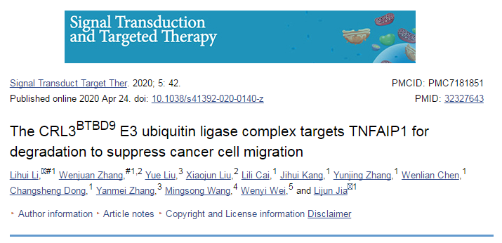 近日,beat365官网附属龙华医院贾立军研究员、李立辉副研究员研究团队在著名国际期刊《Signal Transduction and Targeted Therapy》上发表了题为“The CRL3BTBD9 E3 ubiquitin ligase complex targets TNFAIP1 for degradation to suppress cancer cell migration”的研究文章,通过鉴定TNFAIP1为Neddylation-CRL3BTBD9 E3的新底物,进一步解析肺癌细胞侵袭转移新机制,并为靶向干预中药单体的筛选提供了新思路。
