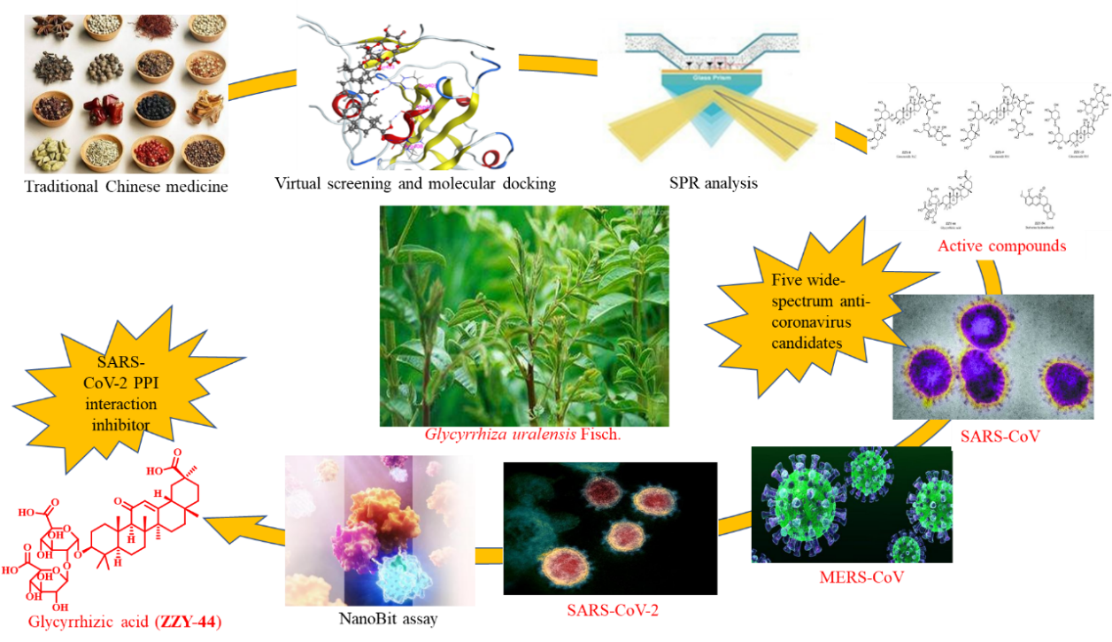 中医药在抗击新冠肺炎疫情中发挥了积极作用。通过现代药理学实验手段从有效中成药和方剂中寻找活性成分并进一步揭示其作用机制,具有重要科学和应用价值。林国强教授团队及陈红专教授团队揭示了从中药甘草中分离得到的活性成分甘草酸的抗新冠病毒的作用机制。研究从临床抗新冠病毒有效的中药方剂出发,通过计算机辅助虚拟筛选并运用SPR及NanoBit等生物技术及药理学的研究发现了甘草酸可以显著阻断新冠病毒棘突蛋白和人体内靶蛋白ACE2的结合,是抗新冠病毒活性的有效中药单体。