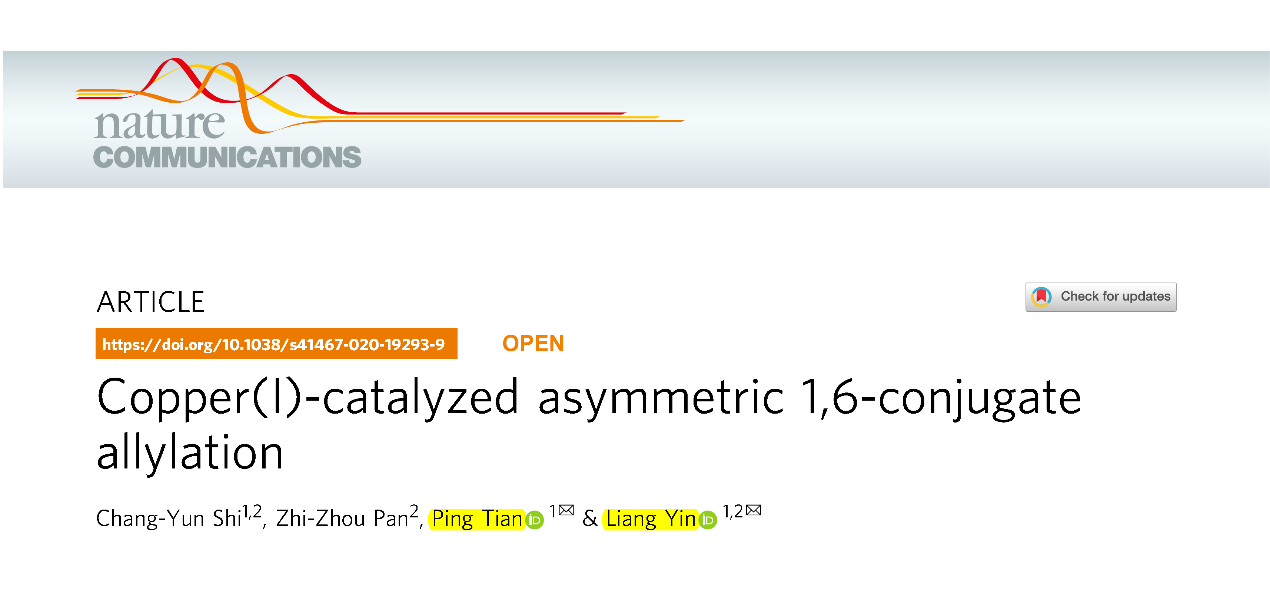 近日,beat365官网创新中药研究院林国强院士团队田平课题组和中国科学院上海有机化学研究所殷亮课题组联合研究团队在《自然通讯》(Nature Communications)上发表研究论文Copper(I)-catalyzed asymmetric 1,6-conjugate allylation,采用金属铜和手性卡宾配体成功实现了催化的不对称1,6-烯丙基共轭加成反应。