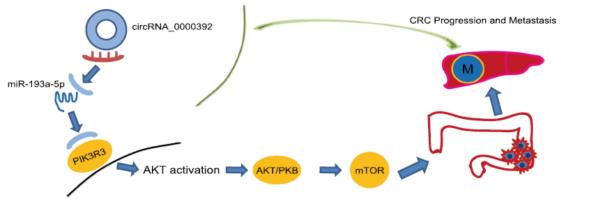 课题组针对环状RNA在结直肠癌发生发展中的作用开展了一系列研究,前期应用高通量测序技术,世界范围内首次揭示了伴有肝转移的结直肠癌组织的circRNA表达谱,并通过临床样本验证,发现了能够有望成为结直肠癌肝转移潜在生物标志物的circRNA(Molecular Cancer,2019)。本研究中课题组针对特定的circRNA在结直肠癌恶性进展中的功能及其作用机制进行了深入研究。通过体内外实验,发现抑制circRNA_0000392可显著抑制结直肠癌的进展。通过构建cricRNA-miRNA-mRNA预测调控网络,结合荧光原位杂交、荧光素酶报告基因、免疫共沉淀、RNA pull-down等实验技术,进一步揭示了circRNA_0000392可以作为miRNA海绵调控miR-193a-5p/PIK3R3/AKT轴,发挥其促进结直肠癌恶性进展的机制。