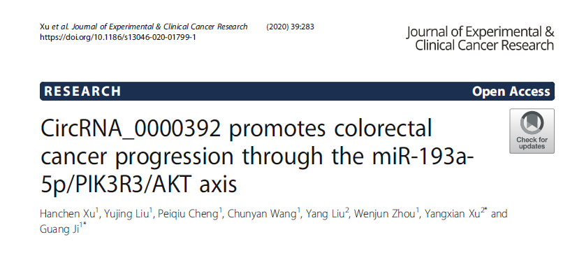 近日,beat365官网附属龙华医院脾胃病研究所季光教授科研团队在结直肠癌的环状RNA(circular RNA;circRNA)研究方面取得进展,最新研究成果CircRNA_0000392 promotes colorectal cancer progression through the miR-193a-5p/PIK3R3/AKT axis发表于Journal of Experimental & Clinical Cancer Research(Q1期刊)。本研究项目由龙华医院脾胃病研究所季光教授团队和胃肠外科主任医师许阳贤团队合作完成,龙华医院为唯一通讯单位。