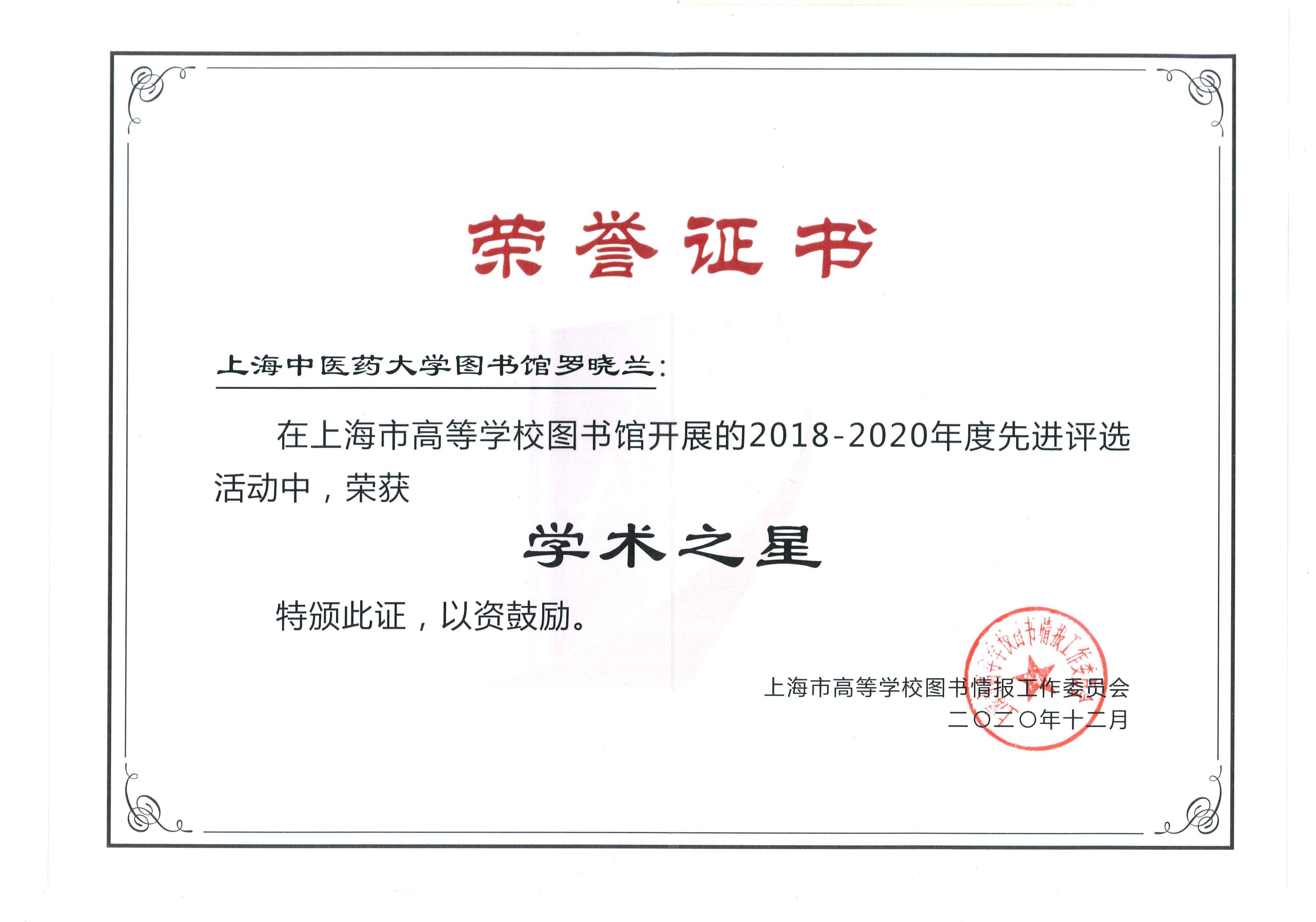 上海市高等学校图书情报工作委员会每两年组织一次评选活动,对在各自岗位上辛勤耕耘、取得良好成绩的集体和个人进行表彰。beat365官网图书馆推荐的先进个人、文献信息教研室的罗晓兰获得“学术之星”称号,这也是她连续第二次获得该项荣誉。