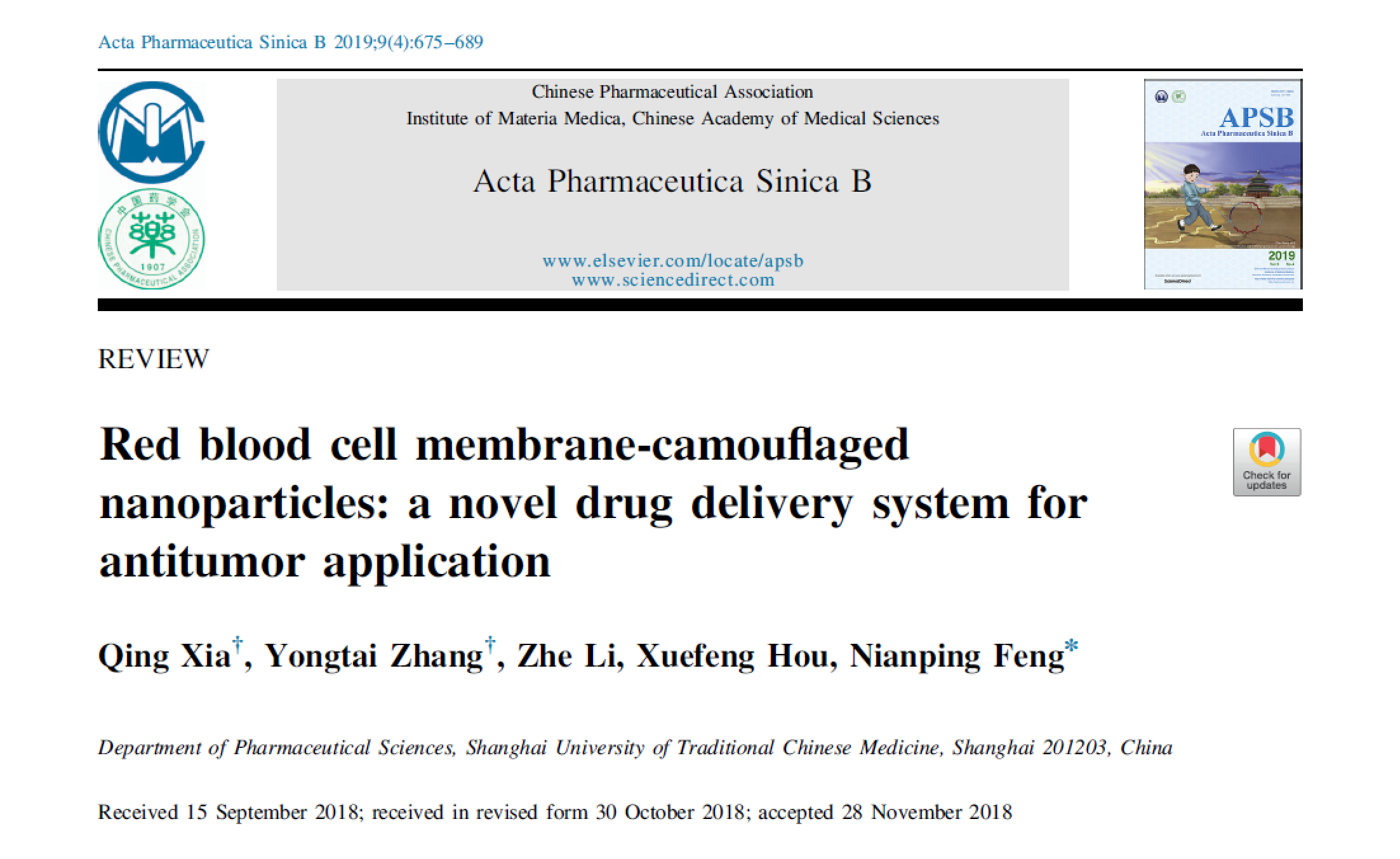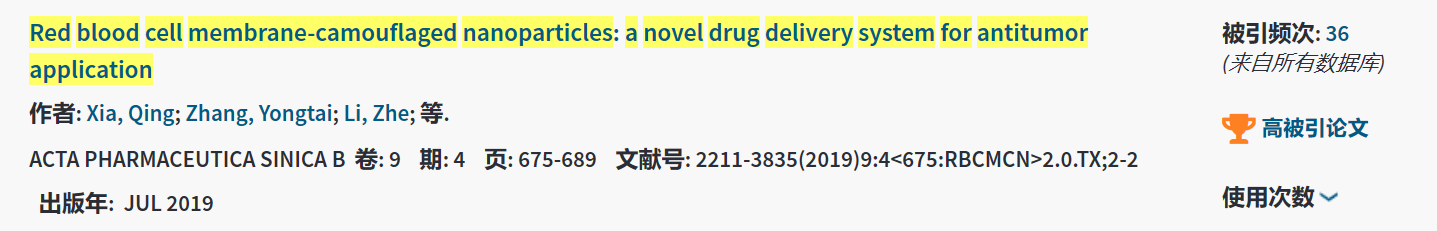 近日,beat365官网冯年平教授团队在《药学学报》英文刊(Acta Pharmaceutica Sinica B)2019年第9期上发表的题为Red blood cell membrane-camouflaged nanoparticles: a novel drug delivery system for antitumor application(《红细胞膜“伪装”的纳米粒:一种新型的抗肿瘤递药系统》)的综述被评为web of science高被引论文,其引用次数归入该学术领域中最优秀的1%之列。