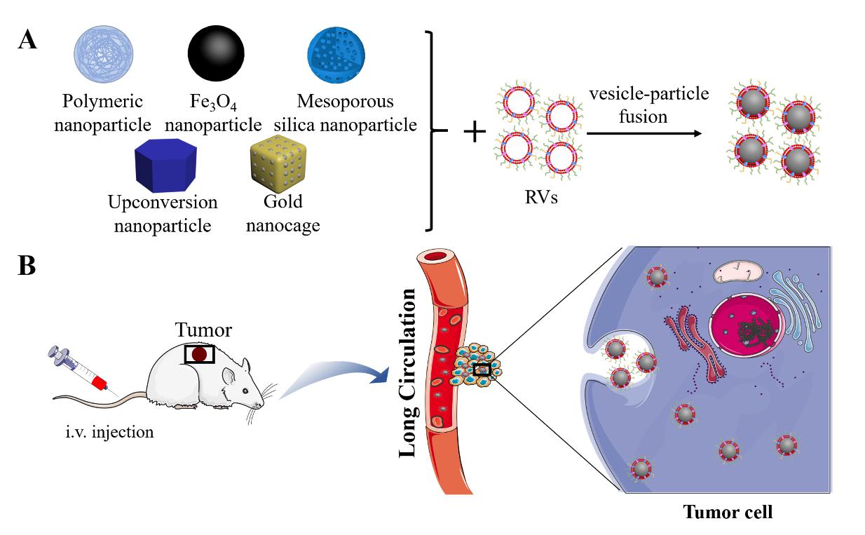 目前,各种各样的细胞膜被应用于纳米仿生系统,包括癌细胞、细菌、淋巴细胞、血小板、白细胞、红细胞等。红细胞膜包覆纳米载体的优势包括:可以逃避免疫系统,实现在体长循环;具有显著的生物兼容性和生物可降解性;可以避免某些纳米制剂固有的毒性;由于细胞膜数量大,具有高负载力;可以提高纳米粒的稳定性。