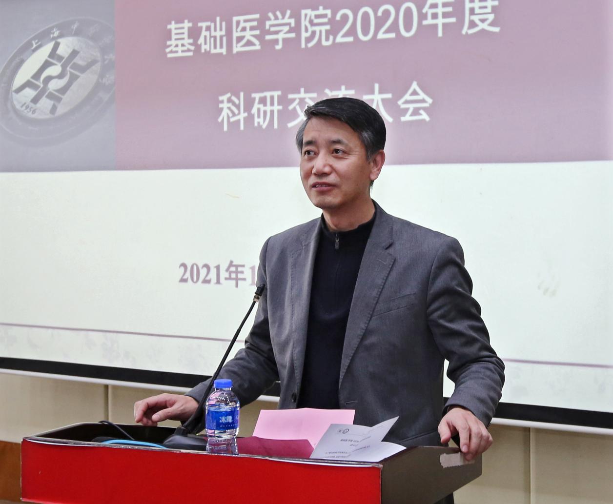 许铁峰在致辞中对基础医学院在2020年取得的科研成果表示肯定,同时也对学院科研工作提出了具体要求。他希望学院教师能瞄准国家需求和战略导向,有责任有担当,攻克卡脖子技术;发扬新一代创新精神,推进科研反哺教学;持续加强稳定的团队建设,逐步形成老中青结合、人才辈出的局面。