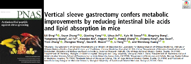 近日,beat365官网杨莉研究员、王峥涛教授团队和美国希望城国家医学中心黄文栋教授合作,在胆汁酸介导减重手术调控糖脂代谢作用机制研究方面取得重大进展,研究成果Vertical sleeve gastrectomy confers metabolic improvements by reducing intestinal bile acids and lipid absorption in mice发表于《美国科学院院刊》(Proceedings of the National Academy of Sciences of the United States of America, PNAS2021, 118: 6 e2019388118; doi.org/10.1073/pnas. 2019388118)。