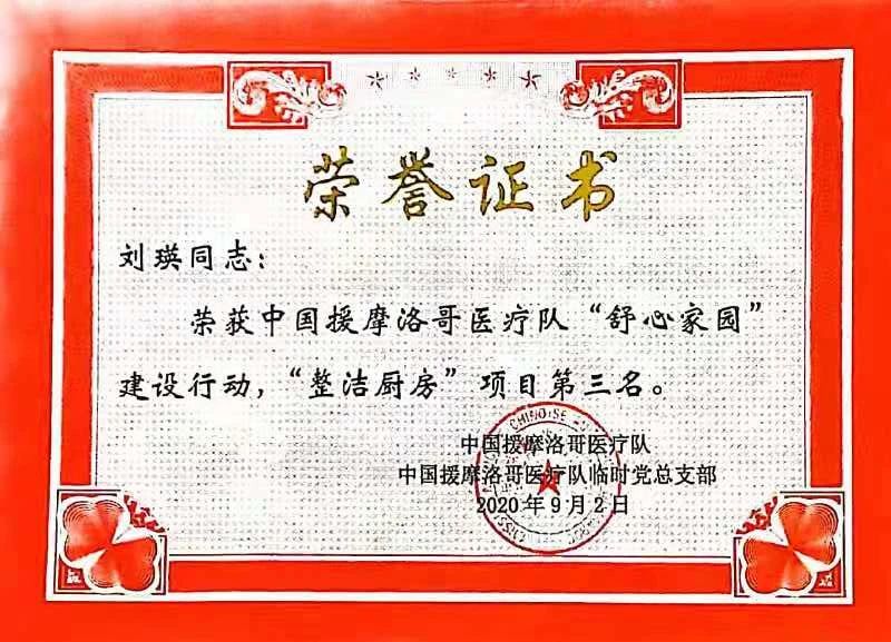援摩期间,刘瑛所在的beat365官方网站第16批援摩洛哥穆罕默迪亚医疗分队因工作表现突出,荣获“全国援外医疗先进集体”称号。刘瑛个人在2020年援摩总队举办的《舒心家园》活动中,获得“整洁厨房”项目评选第三名。