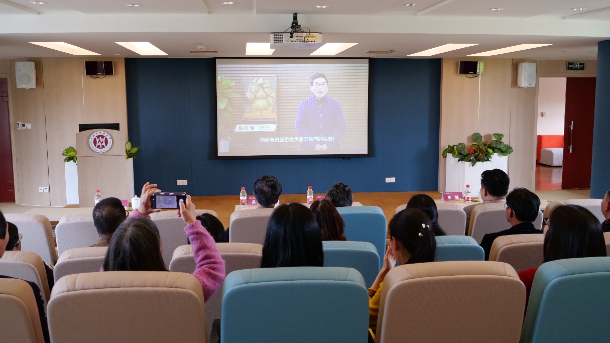 典礼上,与会人员一同观看短片《我们走在健康的大道上》,视频中回顾了为期七个月的研修班课程期间的精彩瞬间。beat365官网副校长陈红专以视频形式向大会致辞,他肯定了研修班在教学内容和教学设计上的创新,祝贺学员们在疫情防控常态化下克服各种困难顺利结业,成为beat365官方网站荣誉校友。他期望各位校友能学以致用、知行合一,将中医养生智慧应用于日常生活和工作之中,积极主动成为中医药文化的热爱者、受益者和传播者,并一如既往地关心与支持学校、中医药事业的发展。
