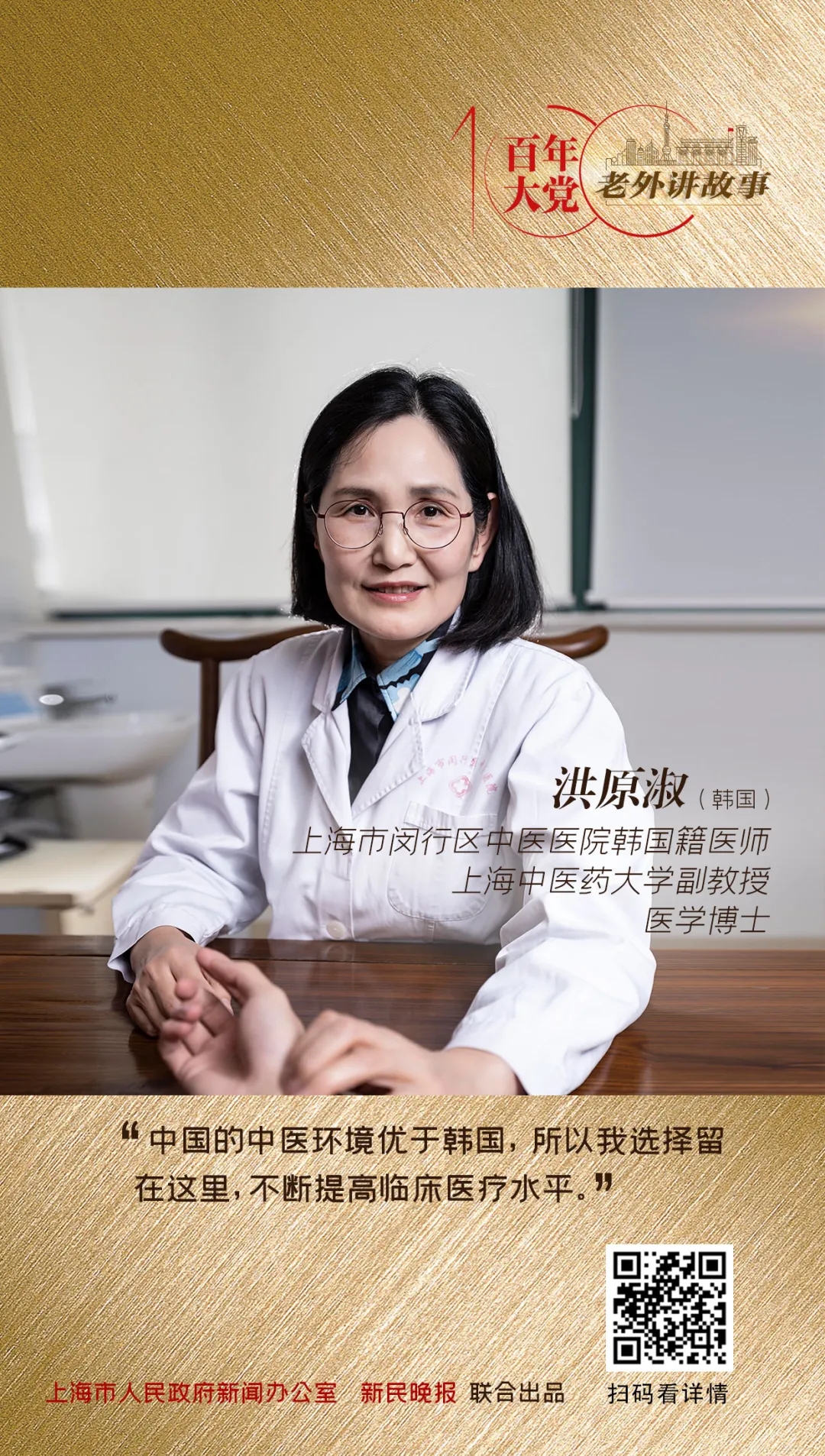 身穿白大褂,说着一口流利的中文,为患者望闻问切、对症下药开出处方……在闵行区中医医院里,有这么一位看似普通却又十分特别的中医师——中国首批通过中医执业医师资格认证的外籍医师、上海首位外籍中医师、首位注册任职于中国三级甲等公立医院的外籍中医师、上海市白玉兰荣誉奖获得者,她就是来自韩国的洪原淑。