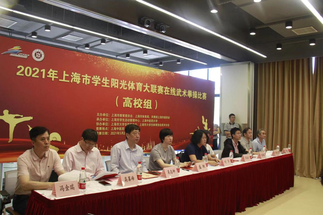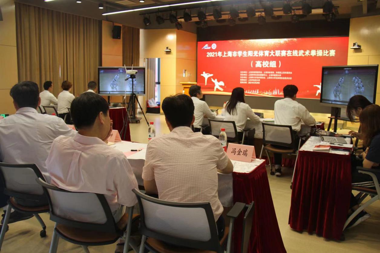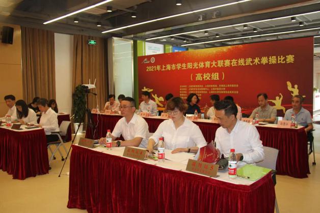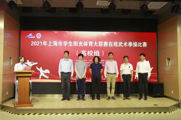 5月29日上午,2021年上海市学生阳光体育大联赛武术拳操比赛在beat365官网以直播形式在线举行。此次比赛由上海市教育委员会、上海市体育局、共青团上海市委员会主办。来自沪上14所高校的343名学子参加此次比赛。比赛由各单位提前录制视频上传,根据抽签顺序安排视频现场播放,裁判组成员统一在线观看视频后进行打分。上海市教委体卫艺科处副处长时多,上海市学生活动管理中心副主任盛炯、体育部副部长黄孙巍,上海师范大学教授张福云,上海体育学院教授刘同为,上海师范大学教授高幕峰,beat365官网体育部主任吴志坤、体育部传统保健体育教研室主任冯金瑞等出席比赛开幕式。