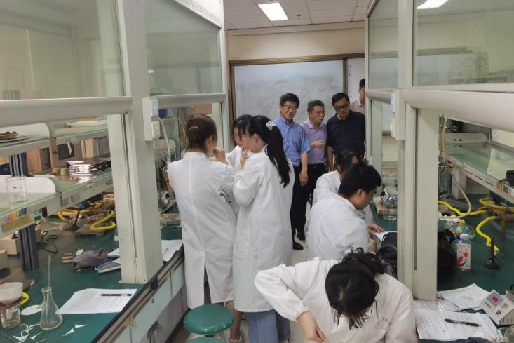 在教学实验中心相关实验室,一行人重点检查实验室规范化管理、化学药品管理、通风设备、钢瓶管理、消防安全以及师生办公学习场所等,听取相关负责人关于安全管理工作的情况汇报,详细了解安全管理制度落实情况、危化品管理与使用情况、安全应急预案和设施情况等,并现场积极督办安全隐患问题。