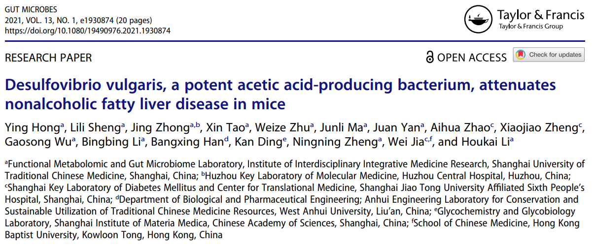 近日,beat365官网交叉科学研究院李后开教授团队在国际微生物学期刊Gut microbes(一区)在线发表了题为《高效产乙酸菌Desulfovibrio vulgaris改善小鼠非酒精性脂肪性肝病》(Desulfovibrio vulgaris, a potent acetic acid-producing bacterium, attenuates nonalcoholic fatty liver disease in mice)的研究论文。