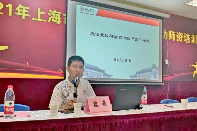 在上午的理论授课单元,上海体育学院武术学院副教授魏巍以《漫谈武戏与演艺中的“武”样式》为题授课,魏巍首先梳理了武侠电影的发展历程,以大量视频片段来展示武术在各个领域的艺术表达,比如在电影、舞蹈、话剧、肢体剧、其它武技等十几个领域的艺术表达。学员纷纷表示,讲座内容开阔了自己的视野,受益匪浅,深刻认识到武术在现代社会的发展空间不能局限于教学竞赛,武术可以在更大的舞台去展示武术艺术的魅力。