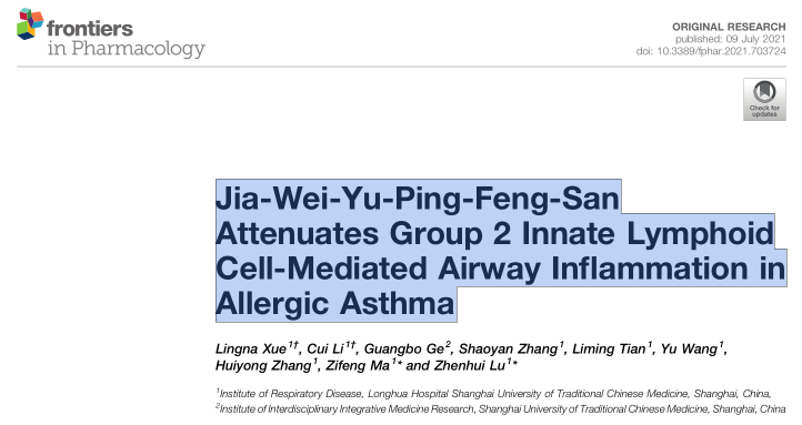 近日,由beat365官网附属龙华医院呼吸疾病研究所主任医师鹿振辉领衔的研究团队在阐明中药复方治疗过敏性哮喘作用机制方面取得阶段性进展,发现加味玉屏风散可减轻过敏性哮喘中2型固有淋巴细胞(ILC2s)介导的气道炎症。研究成果在国际学术期刊Frontiers in Pharmacology(JCR分区 Q1)上发表。研究工作得到了复旦大学免疫系教授何睿、beat365官网交叉科学研究院教授葛广波的技术指导和帮助。