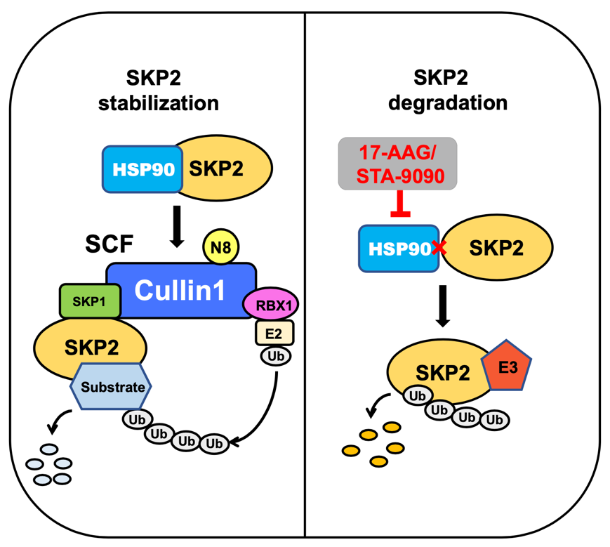 SKP2(S期激酶相关蛋白2)是SCFSKP2泛素连接酶复合物中重要的底物识别蛋白,能够靶向多种抑癌蛋白底物进行泛素化降解。研究表明,SKP2在多种肿瘤中高表达,促进肿瘤发生发展,是一个重要的抗癌治疗分子靶点。热休克蛋白90(HSP90)分子伴侣系统在维持蛋白质稳态中发挥重要的调控作用,能够结合并稳定多种具有促癌作用的“客户蛋白”,从而在多种肿瘤中发挥促癌作用。