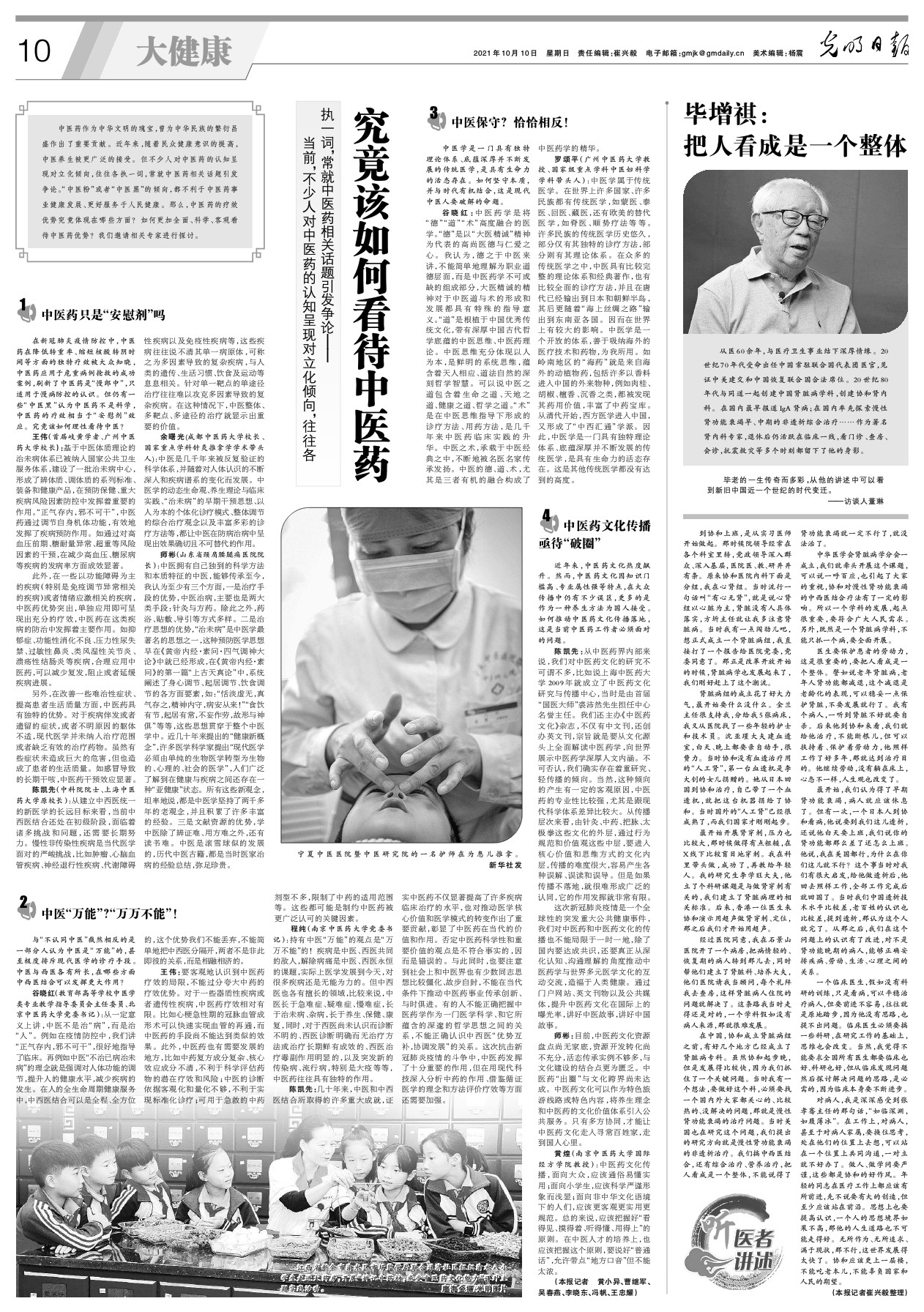 谷晓红(教育部高等学校中医学类专业教学指导委员会主任委员、北京中医药大学党委书记):从一定意义上讲,中医不是治“病”,而是治“人”。例如在疫情防控中,我们讲“正气存内,邪不可干”,很好地指导了临床。再例如中医“不治已病治未病”的理念就是强调对人体功能的调节,提升人的健康水平,减少疾病的发生。在人的全生命周期健康服务中,中西医结合可以是全程、全方位的,这个优势我们不能丢弃,不能简单地把中西医分隔开,两者不是非此即彼的关系,而是相融相济的。