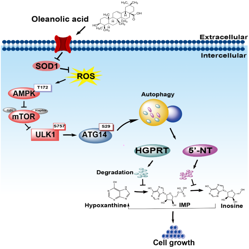 接下来,联合团队对OA调控嘌呤补救合成通路的分子机制开展了深入研究。联合团队发现,OA进入细胞内后,在短时间(8小时)内依次诱导下述分子事件的发生:(1)选择性抑制超氧化物歧化酶1SOD1)活性;(2)上调胞内的活性氧簇(ROS);(3)激活AMPK、抑制mTORC1;(4)激活自噬/溶酶体降解通路;(5)降解嘌呤补救合成通路中的关键酶HGPRT5'-NT;(6)最后下调嘌呤补救合成通路活性,从而抑制肿瘤细胞的DNA复制和恶性增殖。