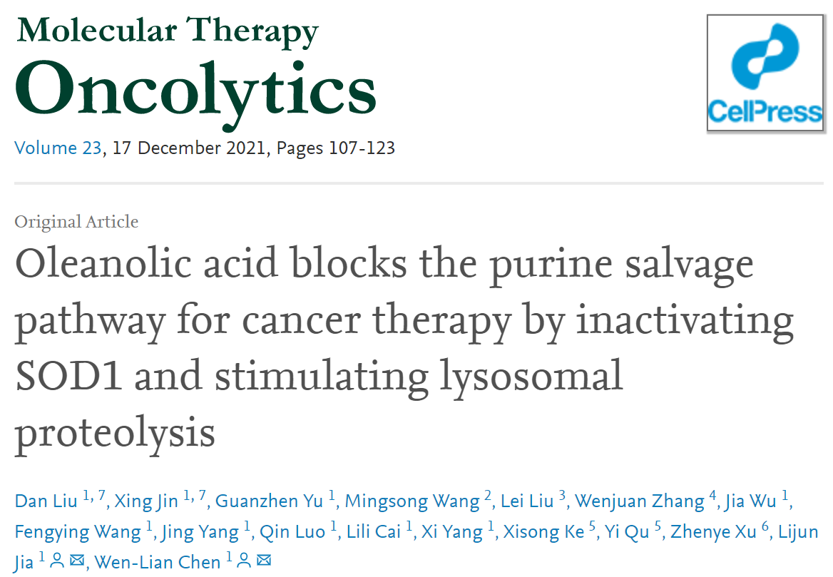 附属龙华医院、上海市中医药研究院中医肿瘤研究所陈文连、贾立军联合团队,选取中药女贞子中含量高的抗肿瘤活性成分——齐墩果酸(Oleanolic acid, OA),针对其下游代谢靶点以及相关的分子调控机制,开展了深入研究。近期,联合团队以研究论文形式在分子治疗领域的国际权威期刊Molecular Therapy—Oncolytics上发表了最新研究成果Oleanolic acid blocks the purine salvage pathway for cancer therapy by inactivating SOD1 and stimulating lysosomal proteolysis