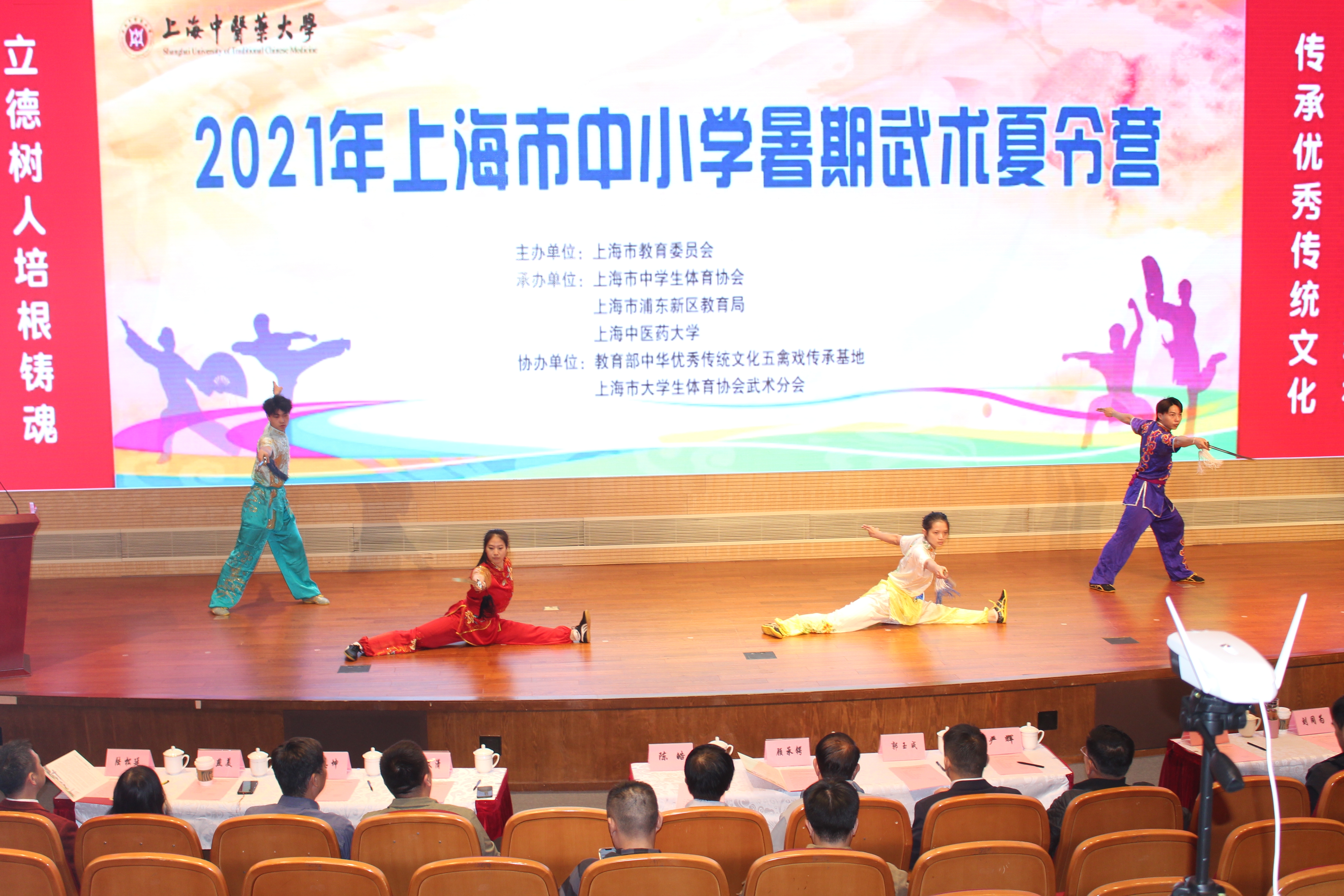 浦东新区学生活动中心体育活动部部长严军平、上海市大学生及中学生体育协会竞赛部部长赵文潇为优秀教练员颁奖,上海市武术协会常务副会长严辉、上海武术院院长陈皓为优秀组织奖颁奖,上海体育学院武术学院院长郭玉成、上海市大学生及中学生体育协会副秘书长顾承锷为学员颁发结业证书。