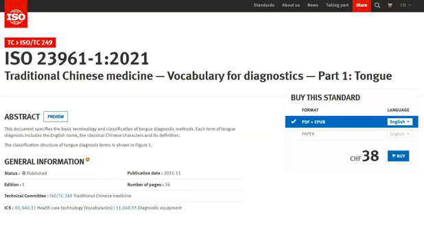 近日,国际标准化组织(ISO)正式发布了国际标准“中医诊断名词术语第一部分:舌诊”(ISO 23961-1:2021 Traditional Chinese medicine - Vocabulary for diagnostics - part1:Tongue)和“中医诊断名词术语第二部分:脉诊”(ISO 23961-2:2021 Traditional Chinese medicine - Vocabulary for diagnostics - part2:Pulse)。