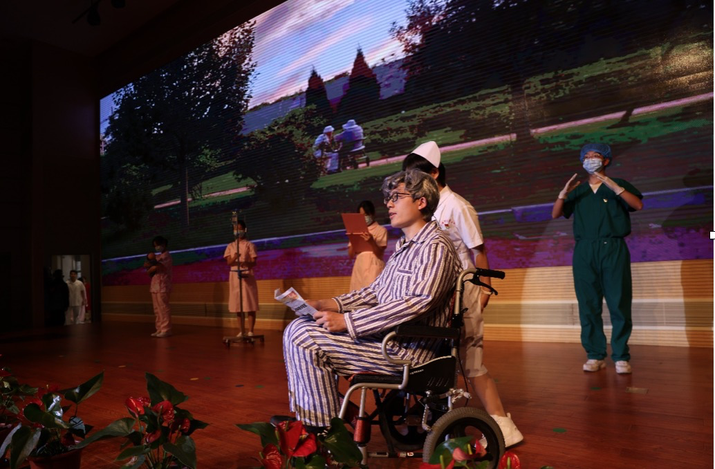 护理学院党总支书记史美育带领师生回顾了我国医疗卫生事业发展的百年征程,在党的领导下,一代代护理人为健康中国建设不懈奋斗。情景剧《红色护理》从老红军战士的回忆直观再现了从抗战时期到新中国成立以来,我国医疗卫生事业的蓬勃发展和护理人的奉献担当,充分诠释了信仰底色。