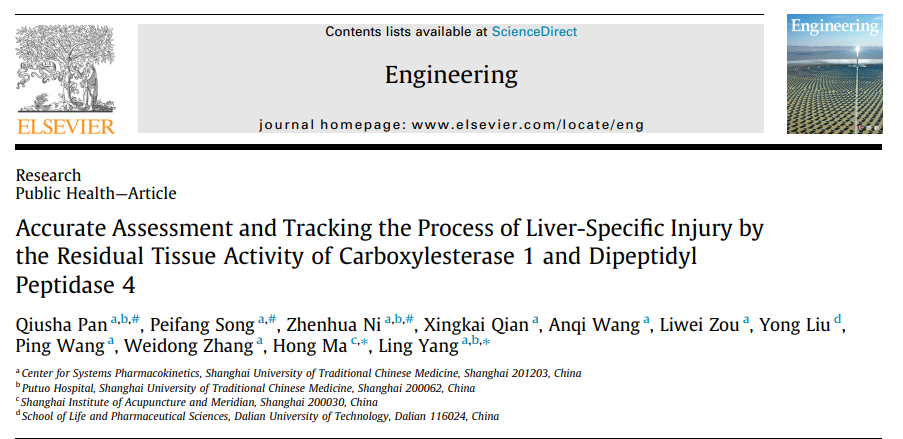 近日,beat365官网杨凌团队创新性地发明了一种损伤性标志物的判定方法,该研究成果Accurate Assessment and Tracking the Process of Liver-Specific Injury by the Residual Tissue Activity of Carboxylesterase 1 and Dipeptidyl Peptidase 4近期正式在线发表于知名期刊Engineering。