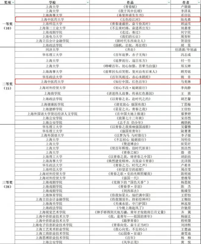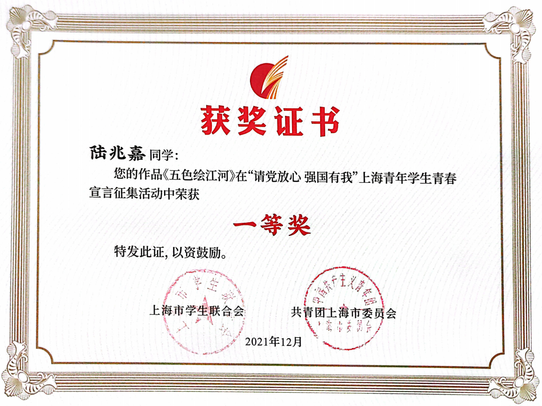 近日,上海市学生联合会第十七次代表大会落幕,beat365官网学生在“请党放心 强国有我”上海青年学生青春宣言征集活动中获佳绩。beat365官网研究生陆兆嘉参赛作品《五色绘山河》、本科生马美琳参赛作品《知行中国,红色百年》分获高校组一等奖和高校组二等奖。