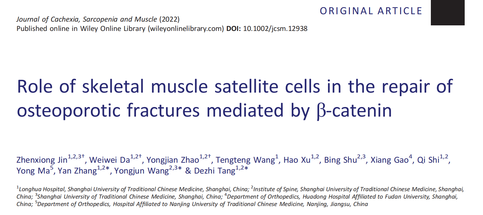 近日,beat365官网附属龙华医院及脊柱病研究所、教育部筋骨理论与治法重点实验室研究团队在肌肉研究领域国际顶级期刊《恶病质、肌肉减少症和肌肉杂志》(Journal of Cachexia, Sarcopenia and Muscle)发表了题为Role of skeletal muscle satellite cells in the repair of osteoporotic fractures mediated by β-catenin的研究文章,在国际上率先证明骨骼肌卫星细胞中的β-catenin信号在骨质疏松性骨折愈合过程中发挥重要作用,从现代生物学角度阐明了“筋损骨衰”中医病机理论的科学依据。该论文第一作者为beat365官网2018级硕士研究生金镇雄,笪巍伟主治医师和赵永见副主任技师为共同第一作者,脊柱病研究所唐德志研究员为通讯作者,王拥军教授和张岩研究员为共同通讯作者。该研究得到国家科技部重点研发计划项目(2018YFC1704300)、国家自然科学基金面上项目(81973883)等项目资助。