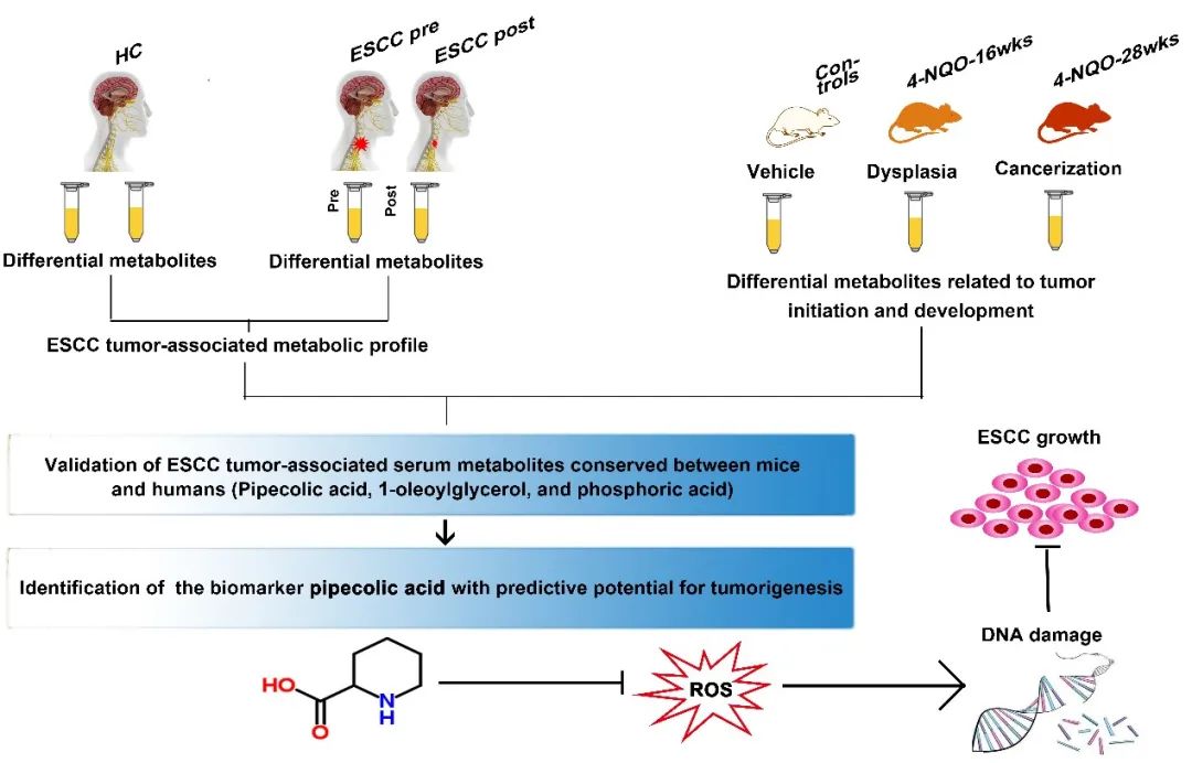 该研究还利用致癌物诱导并构建ESCC小鼠模型,获取了正常对照小鼠、食管异形增生(癌前病变)小鼠和ESCC癌变小鼠的血清标本并开展代谢组学研究,阐述食管从正常、到异形增生、再到ESCC癌变过程中血清代谢谱的渐进式改变。发现了小鼠和人类之间变化一致的ESCC肿瘤相关血清代谢物,包括哌啶酸(Pipecolic acid,一种非典型氨基酸)、1-油酰甘油(1-Oleoylglycerol)和亚磷酸(Phosphoric acid)。ROC曲线分析显示,血清哌啶酸可以准确区分正常小鼠和癌前病变小鼠,因此,该代谢物是一个可预测ESCC发生的新型生物标志物。进一步研究发现该代谢物可帮助ESCC细胞对抗氧化应激诱导的DNA损伤和细胞周期阻滞,以支持细胞在不利条件下的存活。研究结果表明,血清哌啶酸可能参与驱动ESCC的发生。