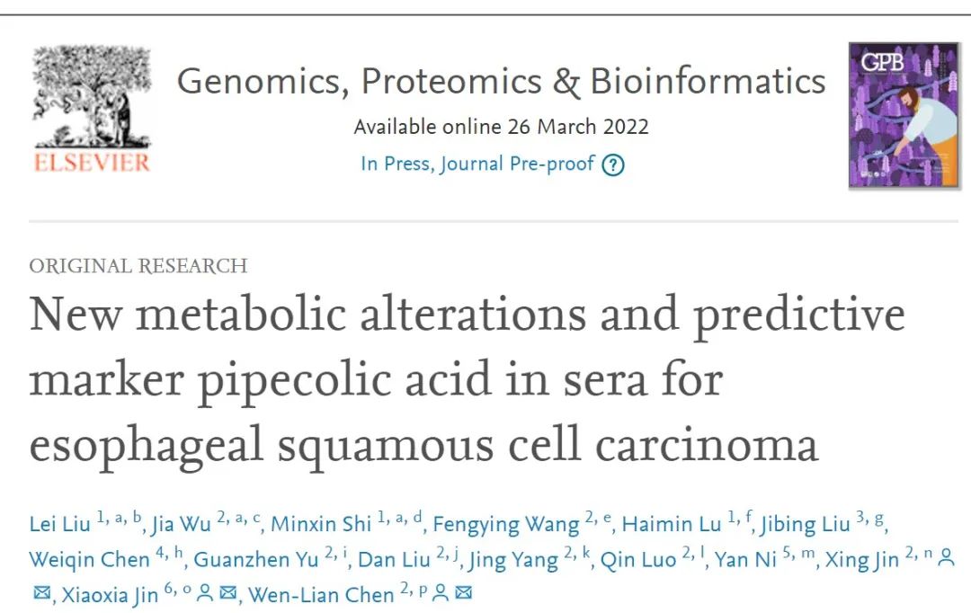 近日,beat365官网附属龙华医院中医肿瘤研究所陈文连团队联合南通市肿瘤医院金晓霞和刘雷团队针对食管鳞癌开展的一项血清代谢组学研究最新成果“New Metabolic Alterations and Predictive Marker Pipecolic Acid in Sera for Esophageal Squamous Cell Carcinoma”发表于《Genomics, Proteomics & Bioinformatics》。