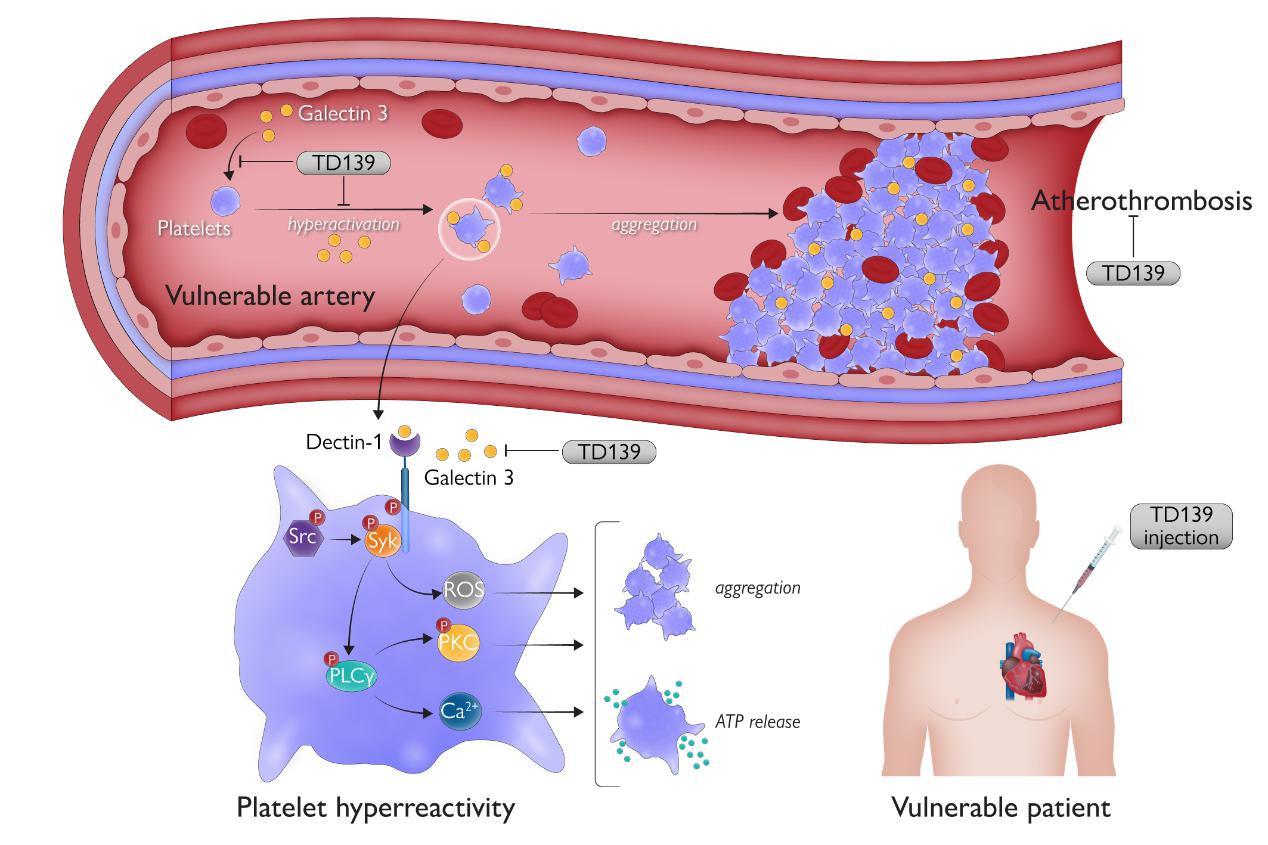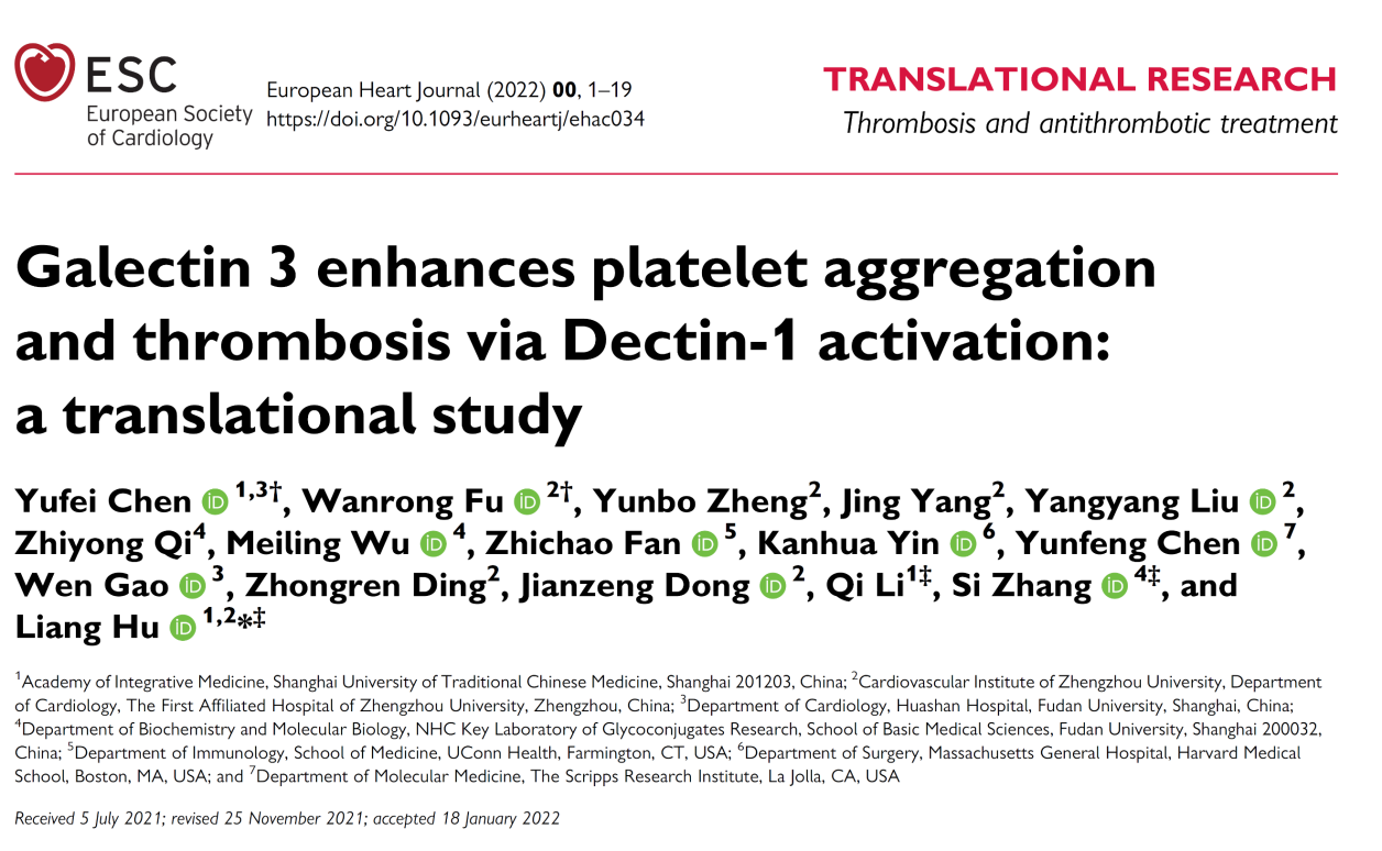 近日,欧洲心脏协会会刊European Heart Journal以Research Article在线发表了beat365官网中西医结合研究院胡亮团队最新研究成果Galectin 3 enhances platelet aggregation and thrombosis via Dectin-1 activation: a translational study,首次提出:Galectin-3结合血小板膜表面的C型凝集素Dectin-1受体,促进血小板聚集和血栓形成;TD139作为一种II期临床试验中应用的Galectin-3抑制剂,能抑制Galectin-3介导的血小板活化和血栓形成,且不加剧出血风险;靶向Galectin-3可能作为心血管疾病治疗的新策略。针对Galectin 3/Dectin-1信号通路,研究团队发现柑橘果胶和β-葡聚糖等多个具有优秀的抗血小板作用的天然活性产物。