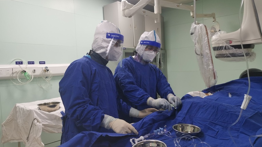 “樊主任,病人急性心梗,需立刻介入手术,核酸已做,报告未出。”伍锋向心脏中心副主任、心内科主任樊民简短汇报。时间就是心肌、时间就是生命!此时的张阿婆出现了心慌、呼吸困难、不能平卧,情况十分紧急。“先手术,救人要紧!”樊民主任的话音落下,医院绿色通道迅速开启。张阿婆按医院疫情防控下急诊手术应急预案流程立即被护送至转运介入中心导管手术室。